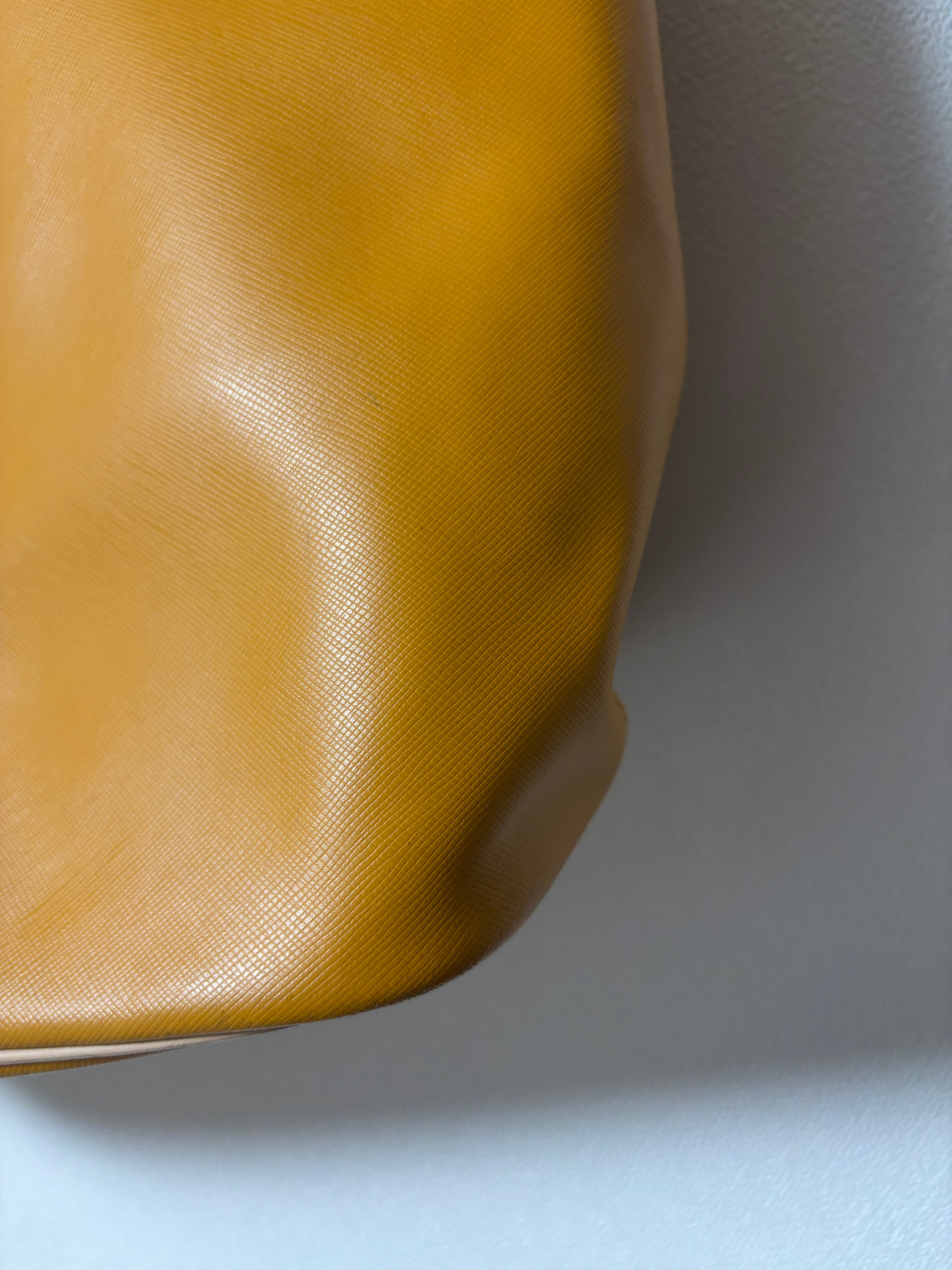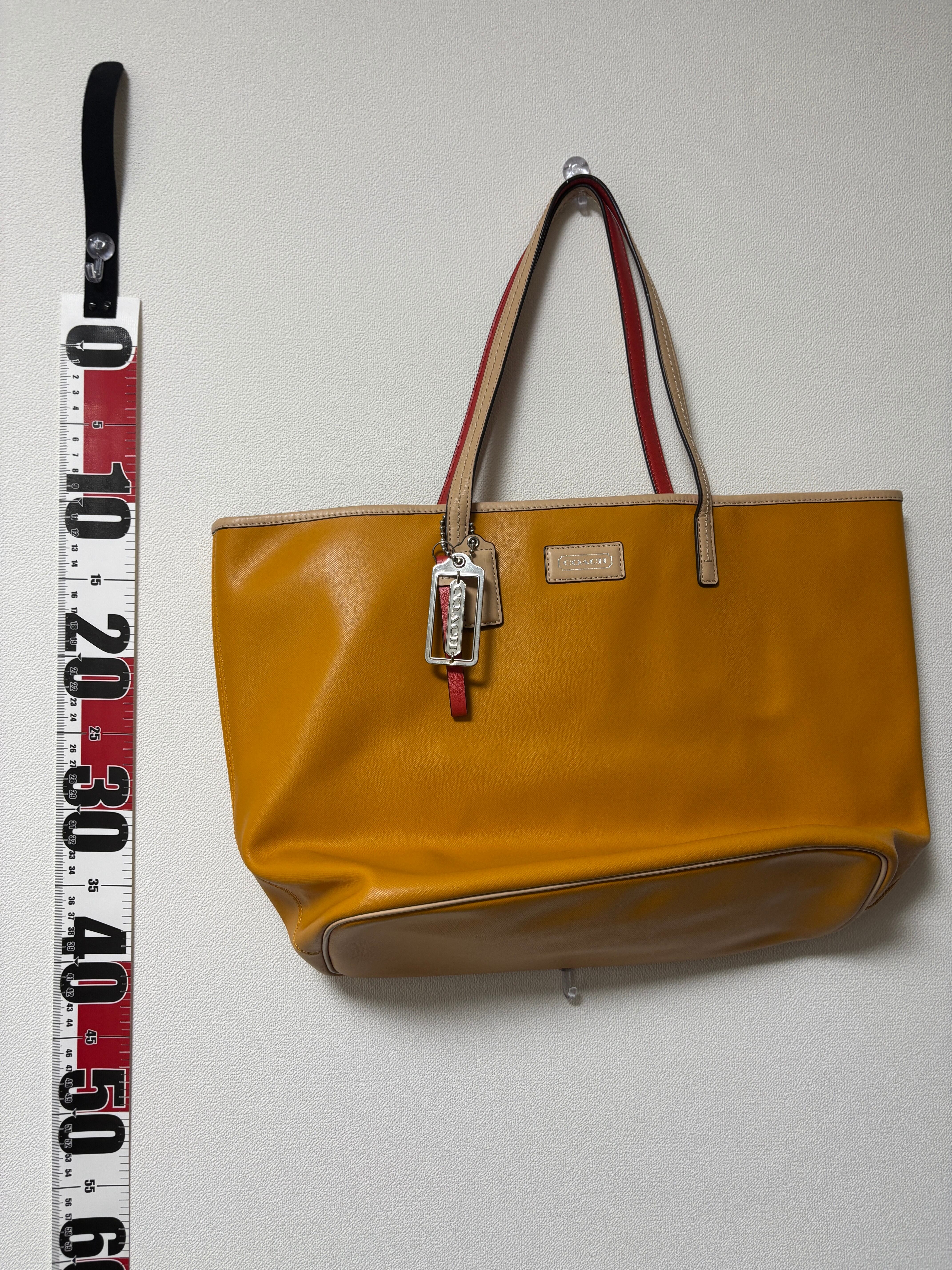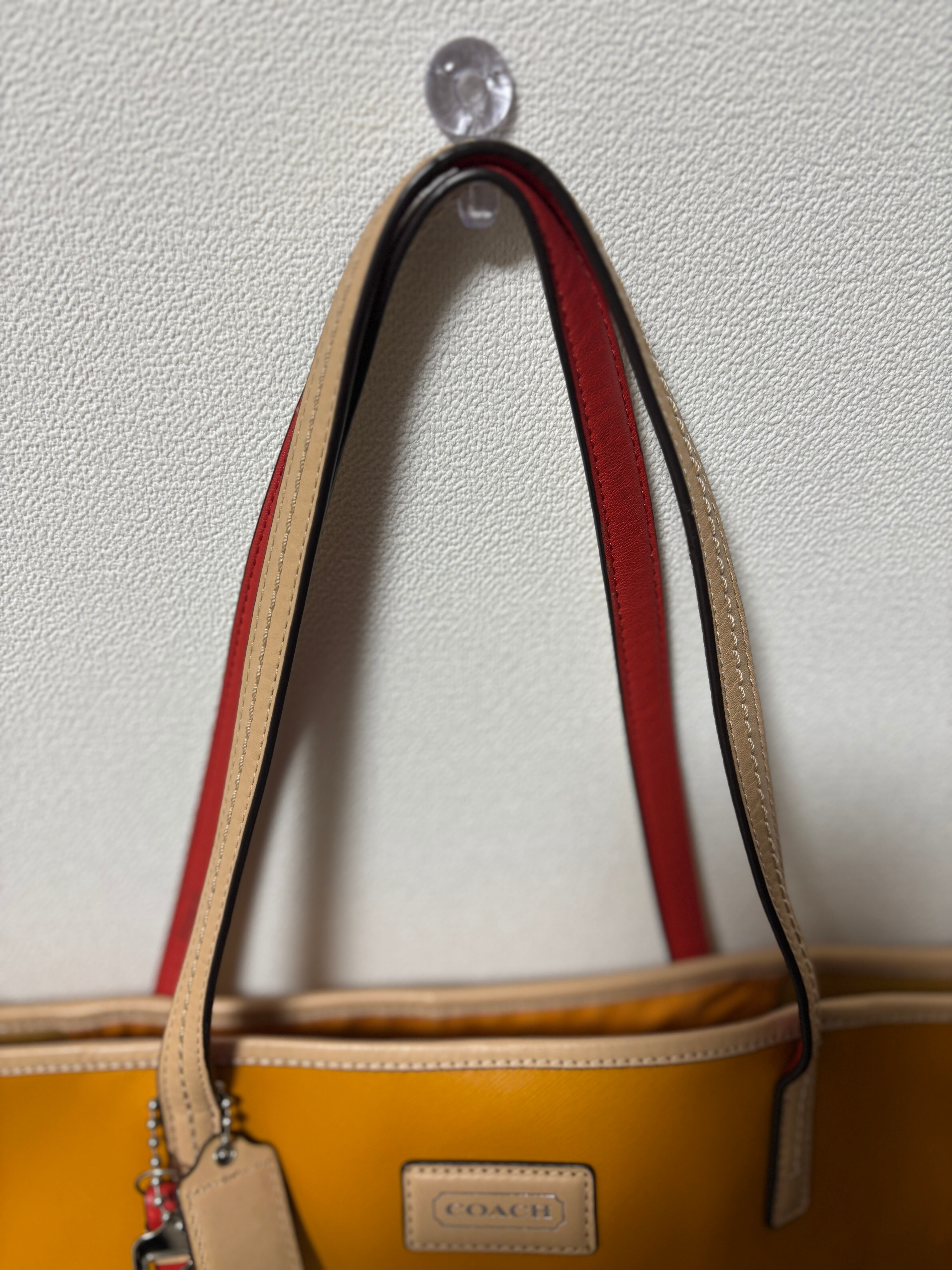 シンプルでスタイリッシュなイエロートートバッグ、合成皮革製で外ポケット付き。